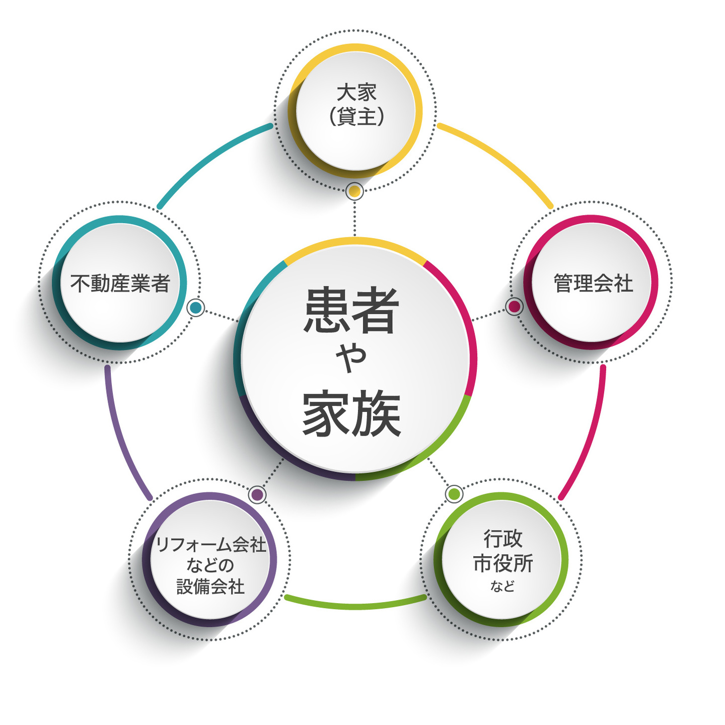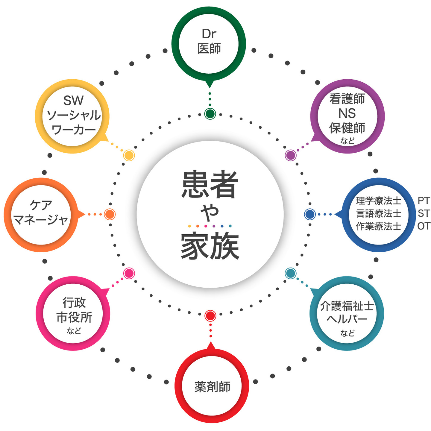 図のように患者さんを支えとりまく環境として他の職種の人々と連携して、包括ケアを行ってきました。各々が良いパートナーとして患者さんを支えている状況だったと思います。